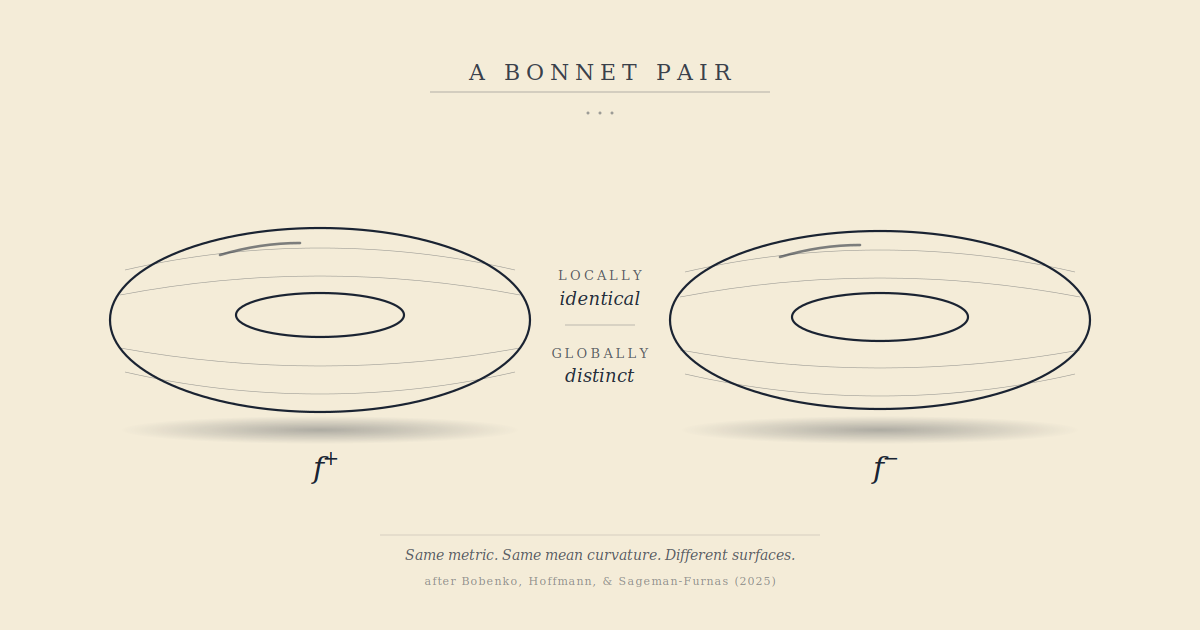 Spheres are uniquely determined by their local data. Tori are not. The difference is the hole. Once a closed surface has a hole, there is slack between what local data can tell you and what the surface actually is, and the slack is large enough to fit two genuinely different shapes inside. The machinery in Bobenko-Hoffmann-Sageman-Furnas suggests that these “Bonnet pairs” exist in considerable variety once the genus is at least one. The slack is not a fluke. It is structural.